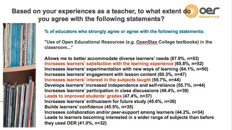 “Almost 90% of respondents thought their students saved money by using OER (89.0%), whilst almost 60% thought their institution benefited financially by using OER (59.3%).”